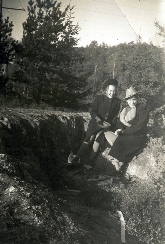 Vid Dammen på Midsommarvägen i Kållered söndag 23/3 1941. Från vänster: Ulla Britt Carlsson Jägrud (f. 1928) och hennes mor Tekla "Titti" Karlsson (f. 1902 d. 1972) som bodde på Midsommarvägen i Kållered.