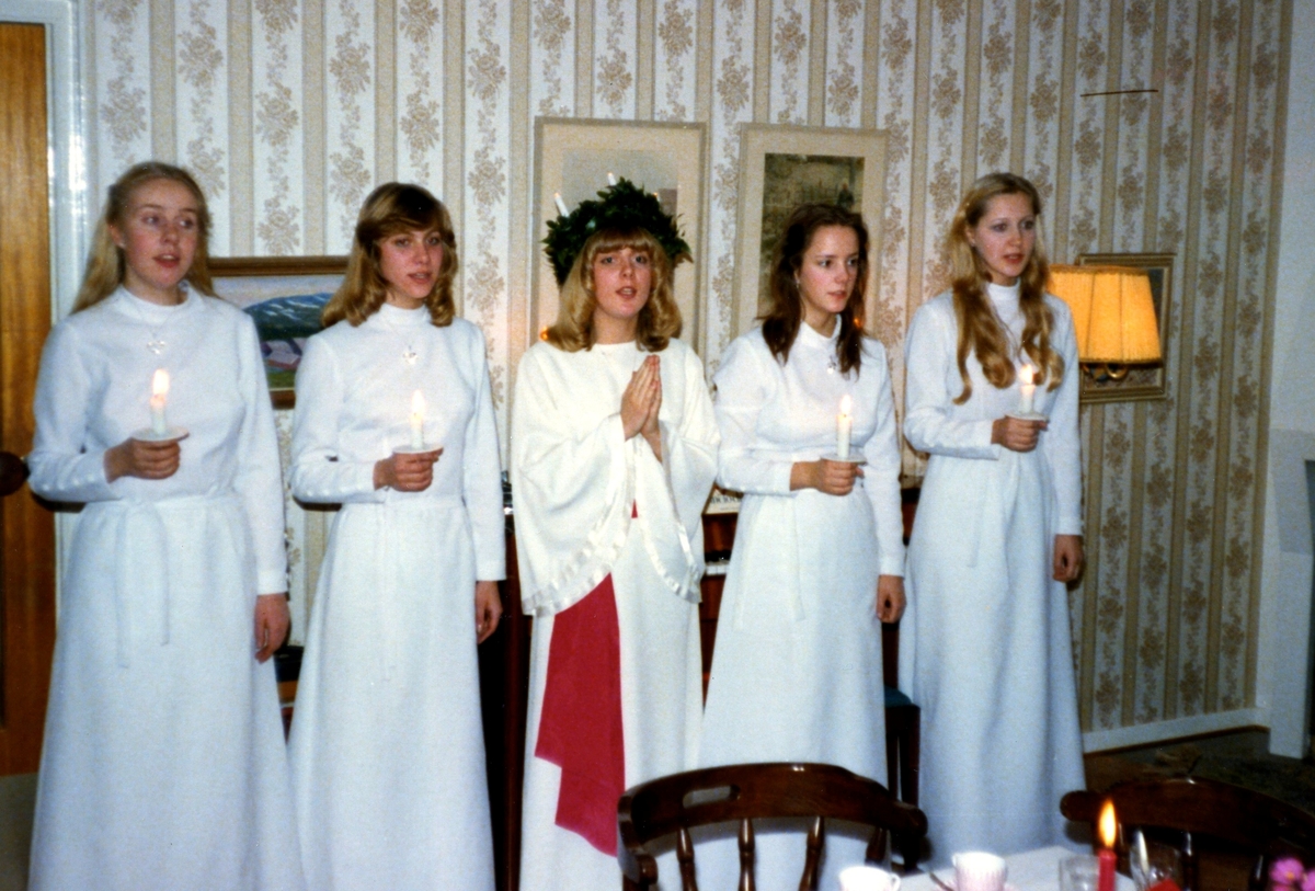 Luciatåg i Brattåshemmets matsal, december 1978. Linda Dahlgren är Lucia, övriga namnuppgifter saknas. Troligtvis har kvinnorna fått var sitt halssmycke som gåva, vilket de bär runt halsen. Relaterade motiv: A1854 samt A1860.