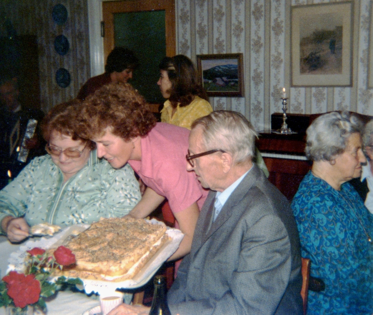 Kokerskan Ingela Sjöberg serverar tårta under en anhörigträff på Brattåshemmet 1979. Från vänster ses Gunvor Olsson (anhörig), Ingela Sjöberg samt Per Pettersson. Relaterat motiv: A1889.