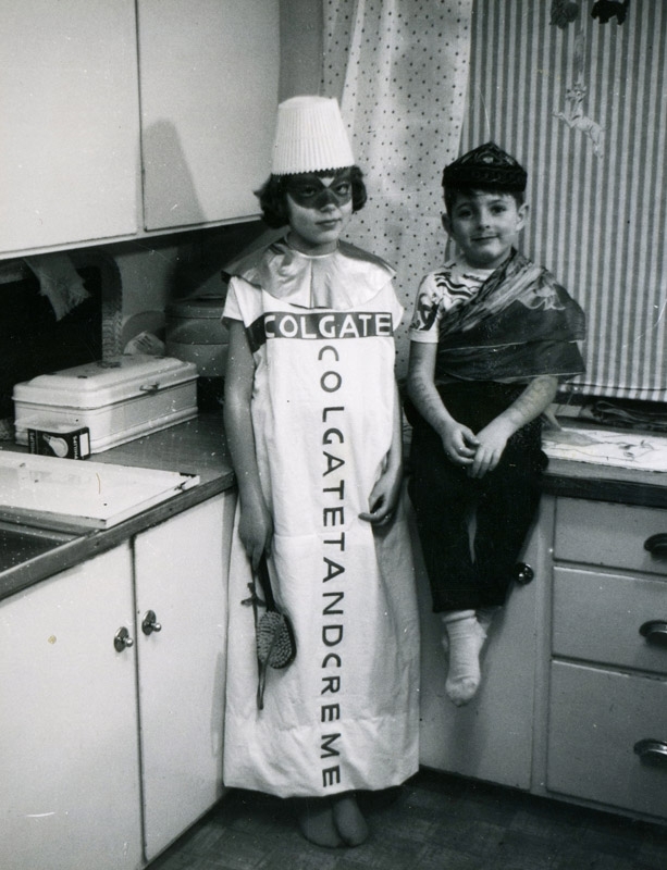 Syskonen Staffan (f. 1953) och Annika Bjerrhede (f. 1948) är på väg till maskerad i kommunalhuset cirka 1957-58. De står i köket på Vommedal Östergård 2:90 "Olas" på Streteredsvägen 21.