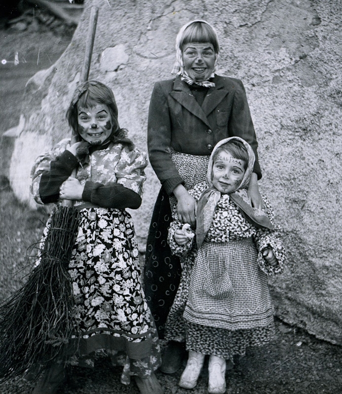 Framför källarmuren till gamla huset vid Vommedal Östergård 2:90 "Olas" cirka 1958. Från vänster: Annika Bjerrhede (f. 1948), Gun Eriksson Paterson (f. 1947) samt Staffan Bjerrhede (f. 1953).