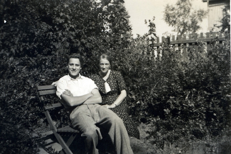 Rune Engström (1921 - 2007) sitter på en bänk bredvid modern Elsa Engström (1892 - 1983). De bodde i lägenhet i ett uthus tillhörande Vommedal Östergård "Skräddarns" där fotot är taget omkring 1940. Elsa arbetade som sömmerska och blev änka 1936.