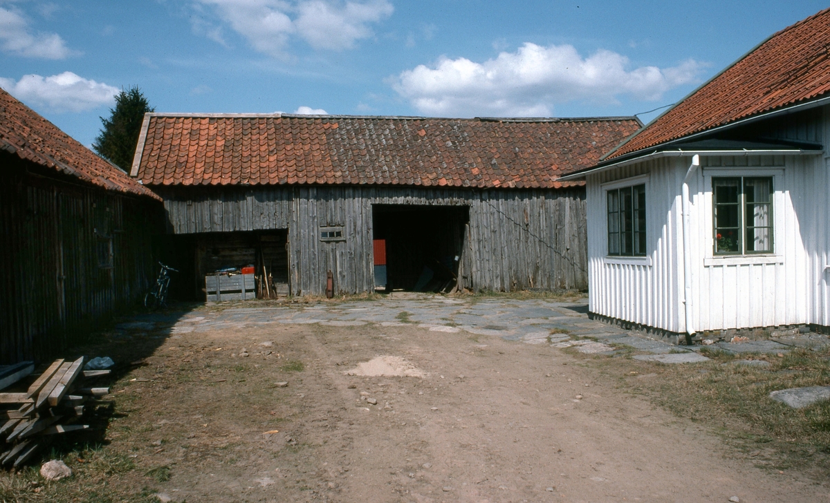 Tuleboäng 3:1 "Ljungbergs" år 1980. En gammal gårdsdel i Tulebo. Ett Tuleboäng-hus från mitten av 1800-talet. Huset och en del av ladugården revs på 1990-talet. Vägen till Dammkärr, Hökkullen med flera gick igenom gårdsplanen och porten i mitten av bilden.