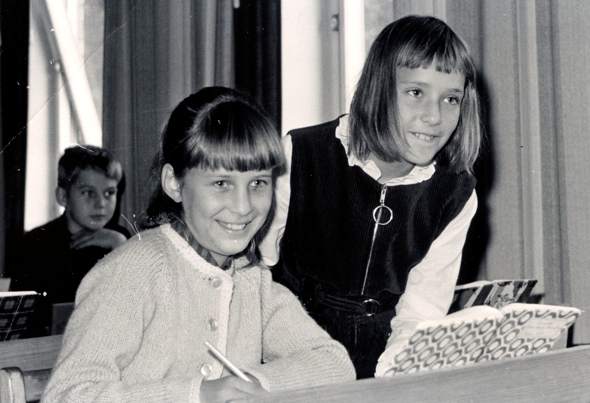 Elever födda 1955 sittandes vid sina skolbänkar i klassrummet på Kålleredsskolan/Brattåsskolan cirka 1965/70.
