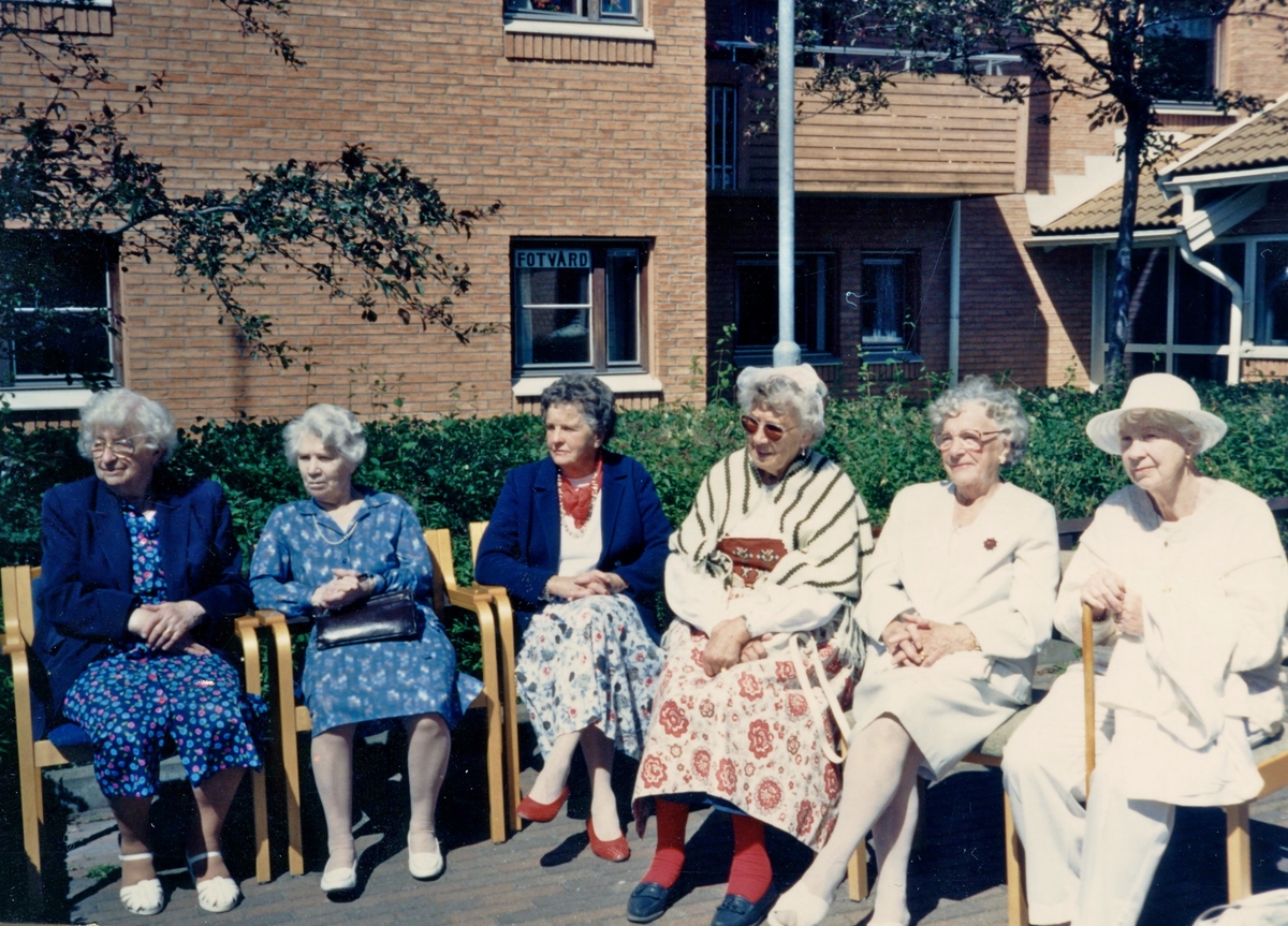 Midsommarfirande utanför Brattåsgården omkring 1990. Från vänster: Berta Matsson (1910 - 2013), Valborg Nilsson (1903 - 2002), Sonja Ljugvall (1921 - 2004), Stina Svensson (1912 - 2001), Ingrid Nilsson (1912 - 2006) samt okänd.