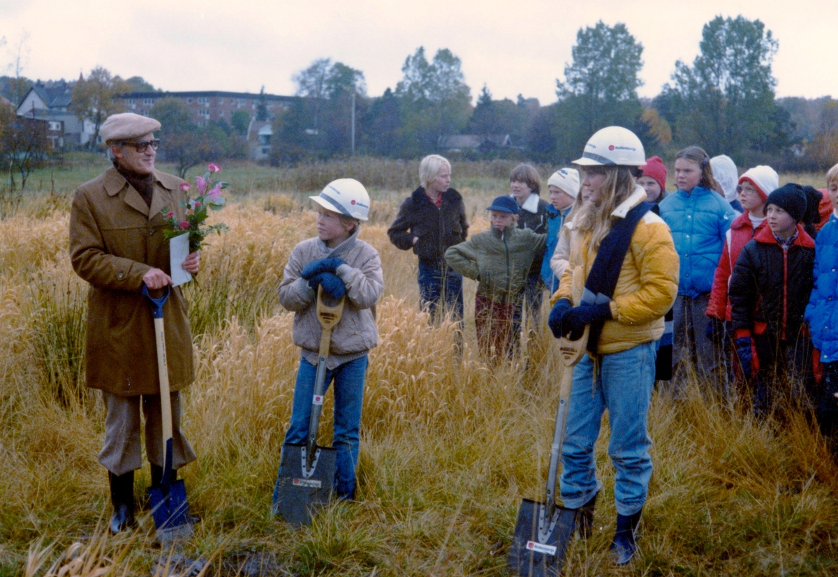 Rektor Gunnar Hillerström, med blommor, har tagit första spadtaget till Ekenskolan, troligtvis 1981. Elever iklädda vita Kullenberg-hjälmar står bredvid. I bakgrunden till vänster ses Missionskyrkans (idag: Ekenkyrkan) vita gavel samt Labackavägen 34E-As lägenhetsområde (i rött tegel).