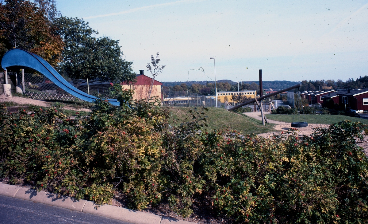 Tomten till gården Hallen 1:5 "Ordförans" år 1979. I mitten ses Hallenskolans gymnastiksal och skorsten. Till höger ett kedjehusområde och lekplats på Mor Annas väg. "Ordförans" byggdes cirka 1900 och låg i närheten av nuvarande Mor Annas väg och Hallavägen. Relaterade motiv: A1216 och A1660.