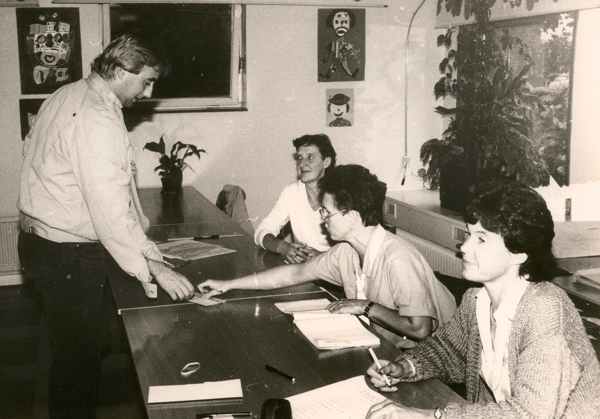 Brattåsskolans matsal som vallokal, 1980-tal. Röstande okänd man står till vänster. Sittande röstmottagare från vänster: Britt Stenbom, Inga Britt Eliasson och Eva Johansson.