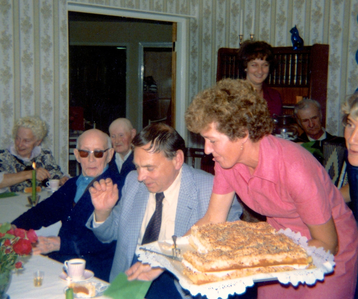 Kokerskan Ingela Sjöberg serverar tårta under en anhörigträff på Brattåshemmet 1979. Från vänster ses Knut Hagberg (i mörka glasögon), Alfred Mattsson (skymtar i bakgrundens mitt) samt Thure Bjerrhede (Knuts släkting från Vommedal). Relaterat motiv: A1892.