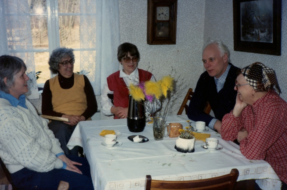 Söndagskaffe i Hembygdsgården Långåker 1:3 under 1980-talet. Från vänster: Emy Johansson (Torrekulla), Eivor Bjerrhede (Vommedal), Gördis Johansson (Heljered), Anton Johansson (Torrekulla) och Ulla Andersson (Sporred).
