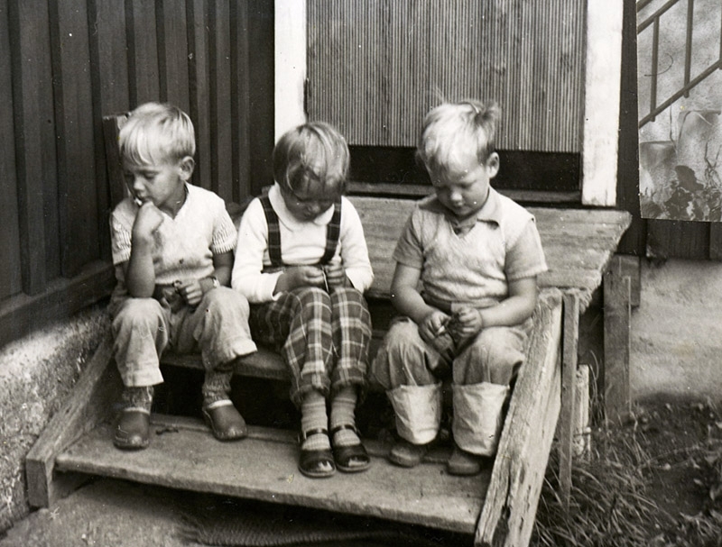 Kusinerna sitter på trappan till det gamla huset, Vommedal Östergård 2:90 "Olas" Streteredsvägen 21 cirka 1953-54.