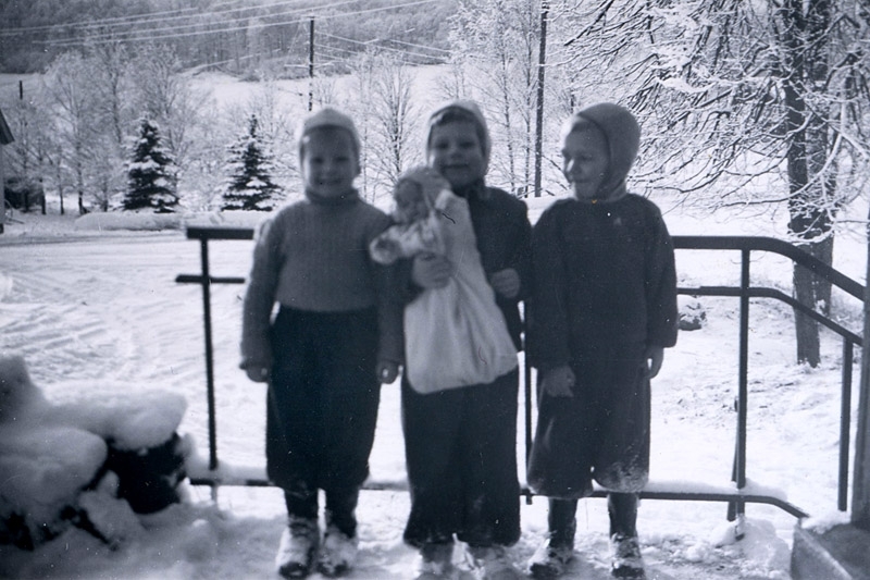 Kusinerna på trappan till det gamla huset. I bakgrunden Streteredsvägen och nuvarande Vommedalsvägen.