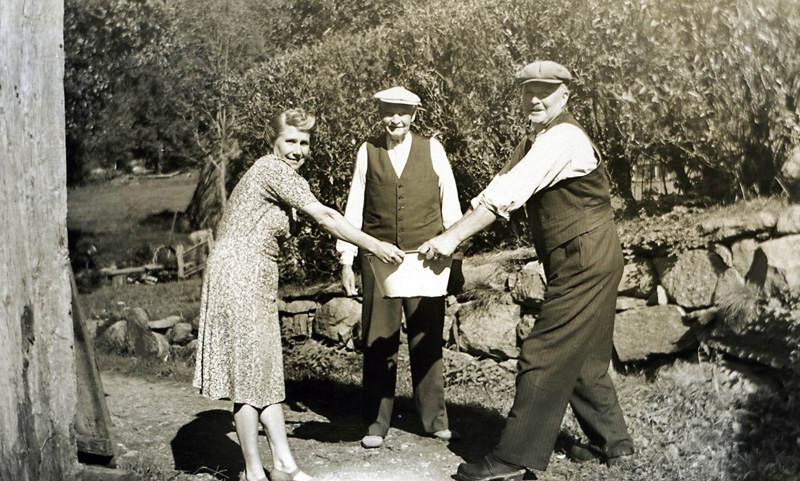 Till vänster Gurli Bengtsson f. 1902 d. 1993. I mitten Albert Bengtsson f. 1878 d. 1956, längst till höger Gustav Bengtsson f. 1893 d. 1979. Albert och Gustav bröder och lantbrukare och deras släkting Gurli var hushållerska. Ladugården till vänster.