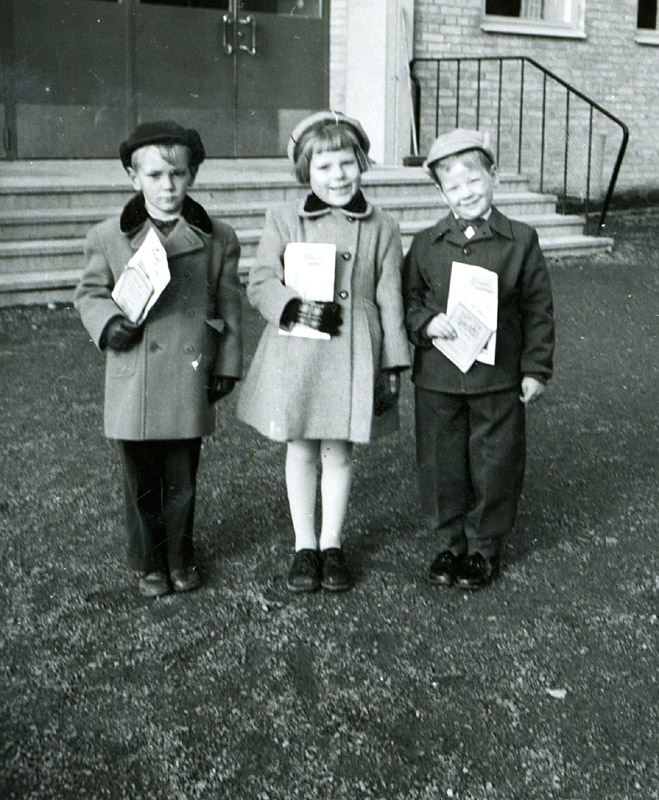 Kållered skolas/Brattåsskolans skolgård på Streteredsvägen 9 (förr: Vommedal Östergård "Olas") cirka 1955. Kusinerna är på väg hem från söndagsskolan i Missionshuset. De håller skoltidningar i handen. Från vänster: Christer Månsson (f. 1947), Annika Bjerrhede (f. 1948) samt Roger Sandberg (f. 1948).