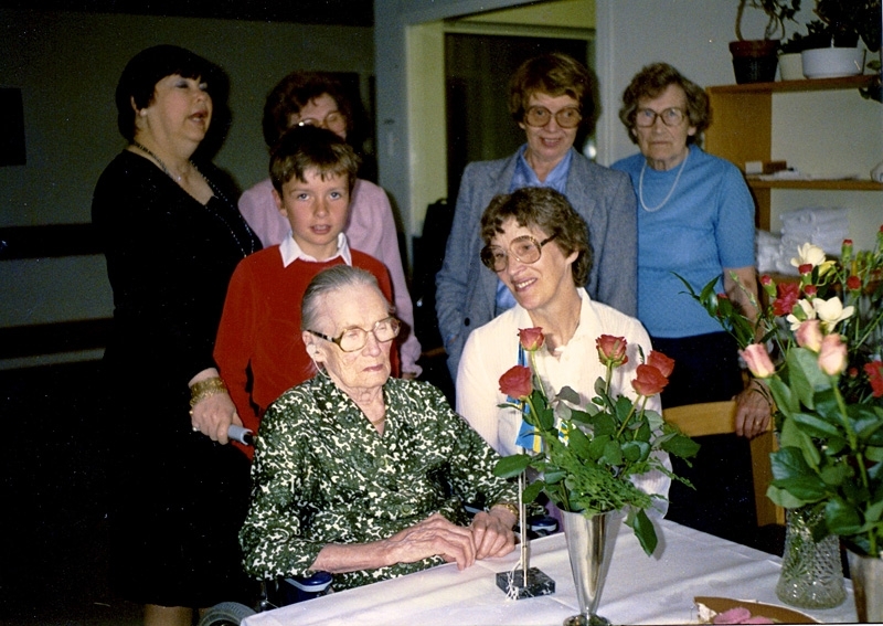 Klara Karlsson Gilander fyller 95 år på Fässbergshemmet år 1982. Sittande från vänster: 1. Klara Amalia, Tollered f. 1887 d. 1982, 2. Maj Werner, Livered, god vän, 3. barnbarn till Klaras man, 4. Son till Bengt Karlsson, 5. Alice Andersson, Kålleredsgården (skymd), 6. Irene Karlsson, Kållered, brorsdotter, 7. Rut Karlsson g.m. Birger Karlsson.