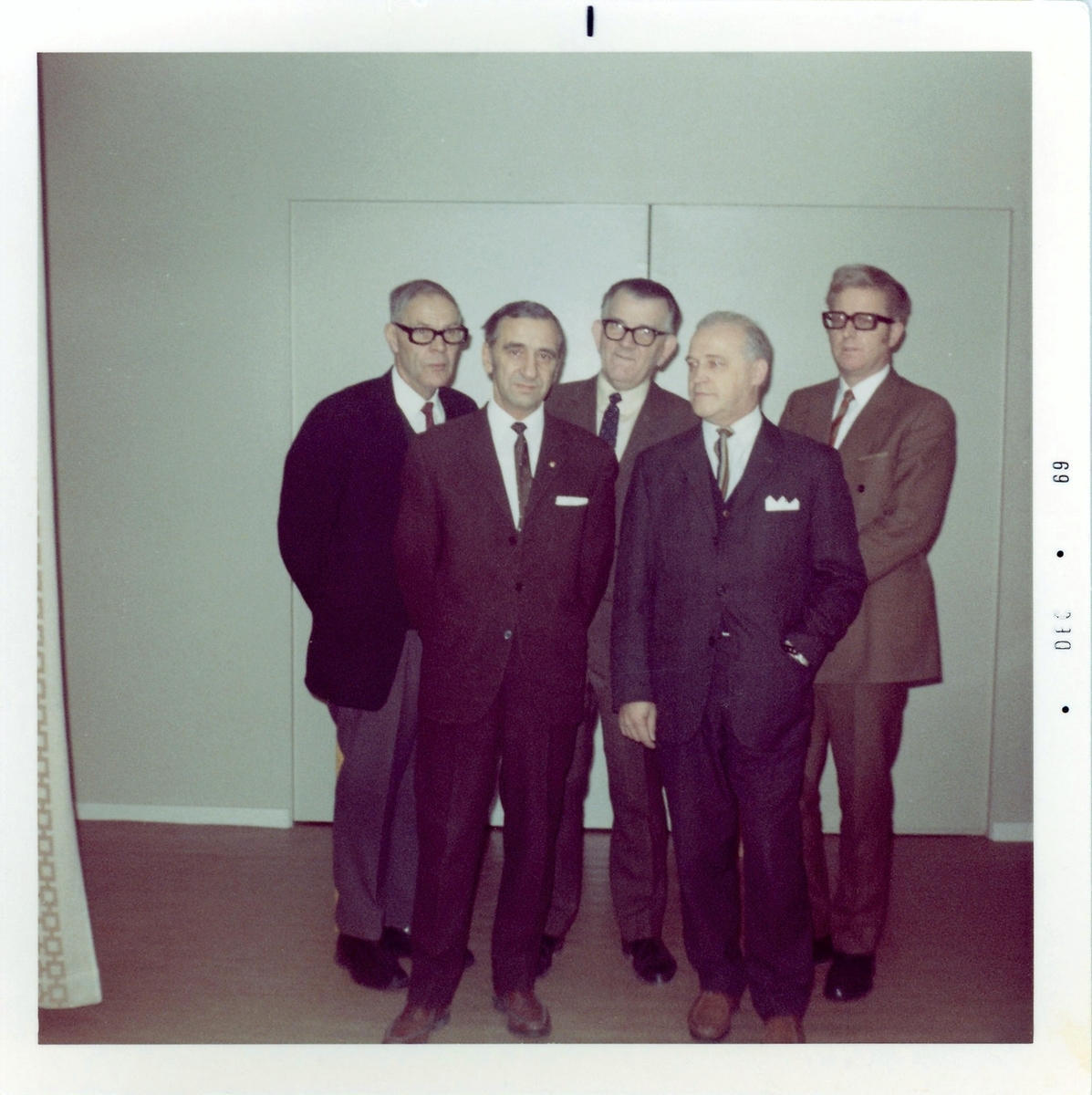 Fem manliga (S)-politiker står i Kållereds kommunalhus på Streteredsvägen 3 (Vommedal Västergård) år 1969. Från vänster: Evert Eliasson (1912 - 1993), Elof Johansson (1912 - 1987), Ivar Andersson (1913 - 2004), Harry Johansson (1902 - 1977), Erik Svärd (1921 - 1983) samt Per-Olof Lundberg (1930 - ).
