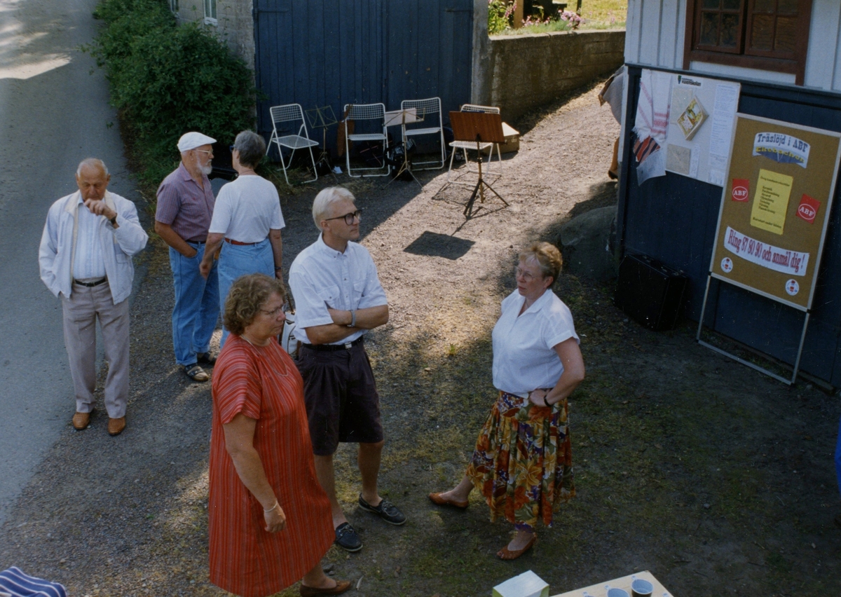 Från vänster: 1: Okänd, 2: Karl Werner (med vit keps), 3: Maj Werner, 4: Ingrid Dowe, ABF (i röd klänning), 5: Anders Oskarsson (ägare till Hantverksgården) samt 6: Eivor Strandefjord, Vuxenskolan.