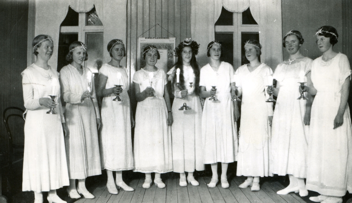 Lucia med tärnor i lilla salen i Kållereds Missionskyrka (idag: Ekenkyrkan) 1930-tal.