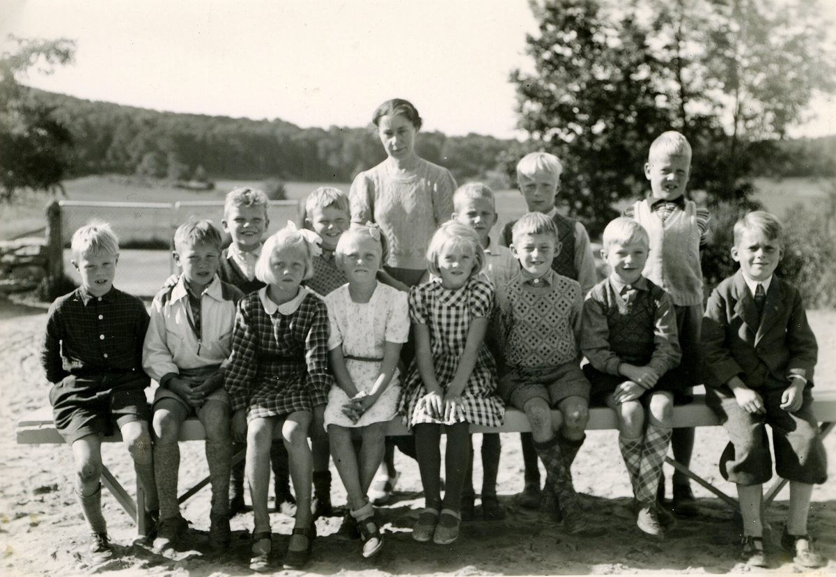 Läraren Greta Hernqvist och elever födda 1934 från Gamla Liveredsskolan, okänt årtal.