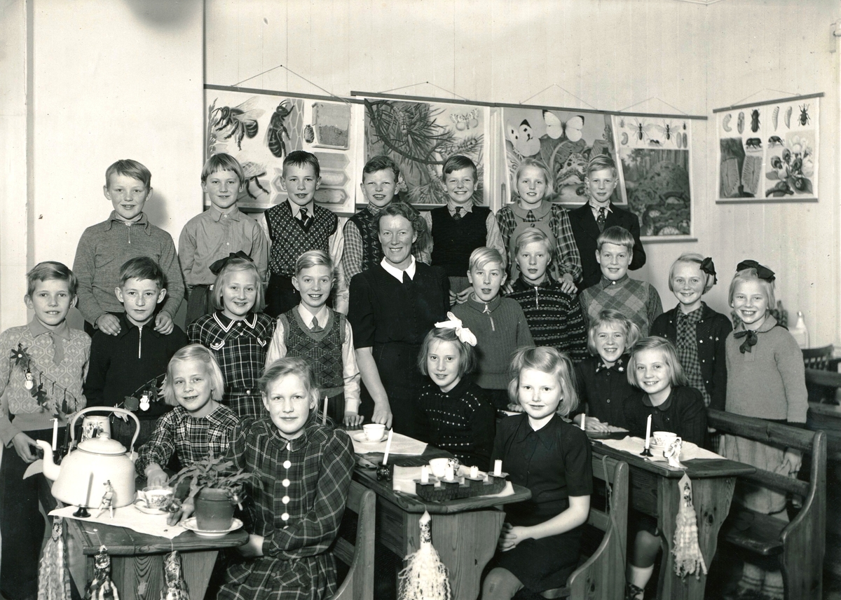 Läraren Jessie Thölén med elever födda 1934, Gamla Liveredsskolan 1947.