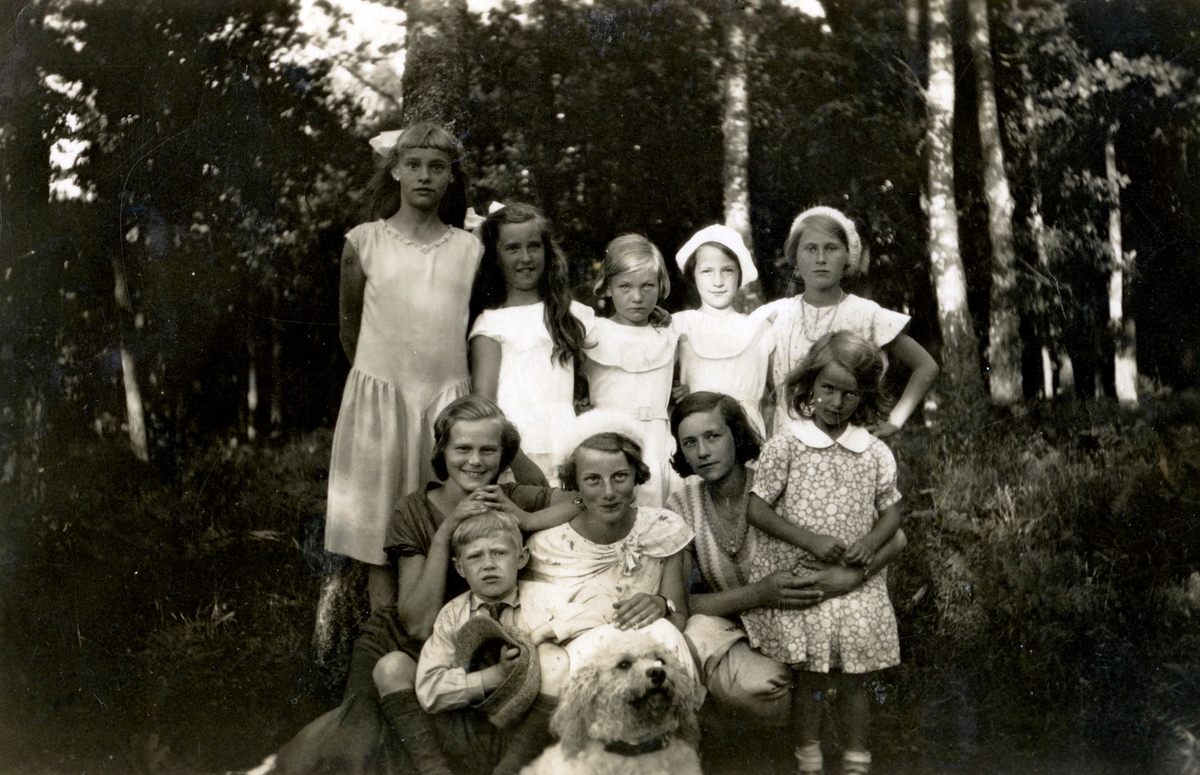 Sittande från vänster: födelsedagsbarnet Inga Bengtsson Jallinder, Högbo (1917 - 2007), Frank Efraimssom, Vommedal (1925 - 1997), Maj Britt Pettersson Björkman (Gustavsberg 1920 - 2011), Maj Engström, Vommedal (1918 - 1938), Ella Gottfridsson Glamhede (1927 - 2015). Hunden Bonzo ses i förgrunden.