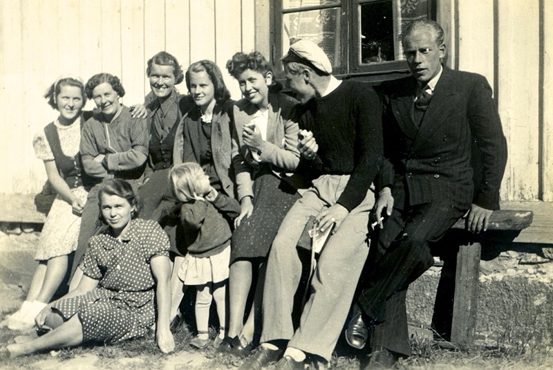 Från vänster: 1: "Issi" Larsson Olsson (1916-2005), 2: Svea Lundholm, sommargäst (1896-1976, gift med Carl Eric, disponent, Luntantug. Gbg), 3: Agnes Larsson Törnqvist (1908-1999), 4: Inga Lill Lundholm, sommargäst, 5: Astrid Larsson, 6: Gösta Lundholm, sommargäst, 7: Gunnar Larsson (1918-2002).