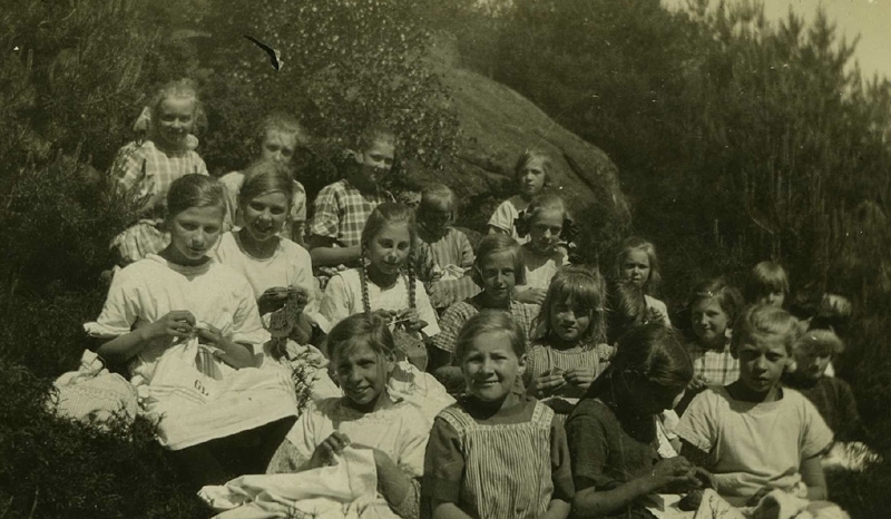 Syslöjd/handarbetslektion i backen bakom Kålleredsskolan i Livered år 1925.