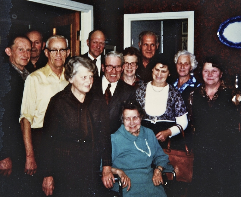 Före detta skolelever samlade hos Mary Ekman på Streteredsvägen 29 cirka 1980. Samtliga hade haft lärarinnan Greta Hernkvist (1895 - 1984) som sitter i mitten av bilden.
