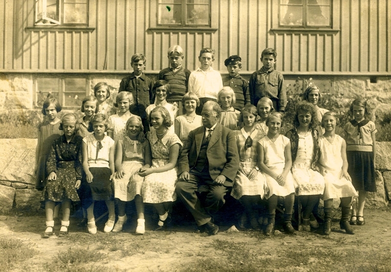 Läraren Birger Ahlström med elver födda 1920-21 utanför lärarbostaden i Livered (Streteredsvägen 59) okänt årtal.