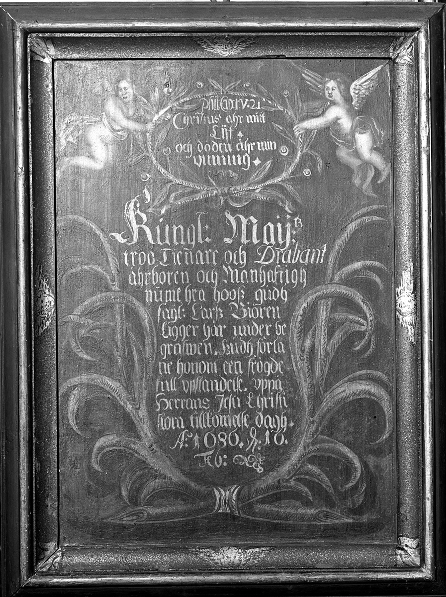 Minnestavla över drabanten Lars Björén, år 1686. Fotograf E Sörman.