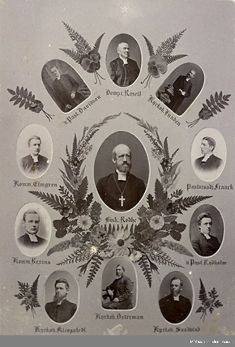 Fotocollage med elva (11) bröstporträtt av präster med olika ämbetsgrad, 1890-tal.