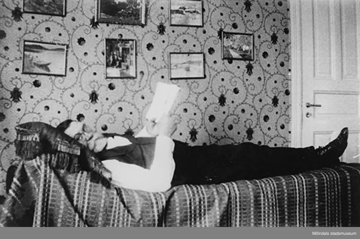 En liggande, äldre man, som tittar in i kameran, 1890-tal.