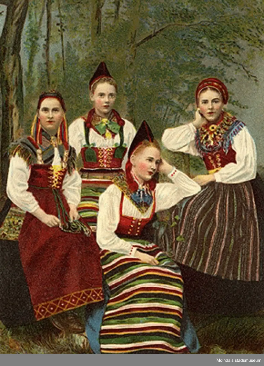Fyra folkdräktsklädda, unga kvinnor, 1890-tal. Fotot är färglagt (kolorerat) i efterhand.