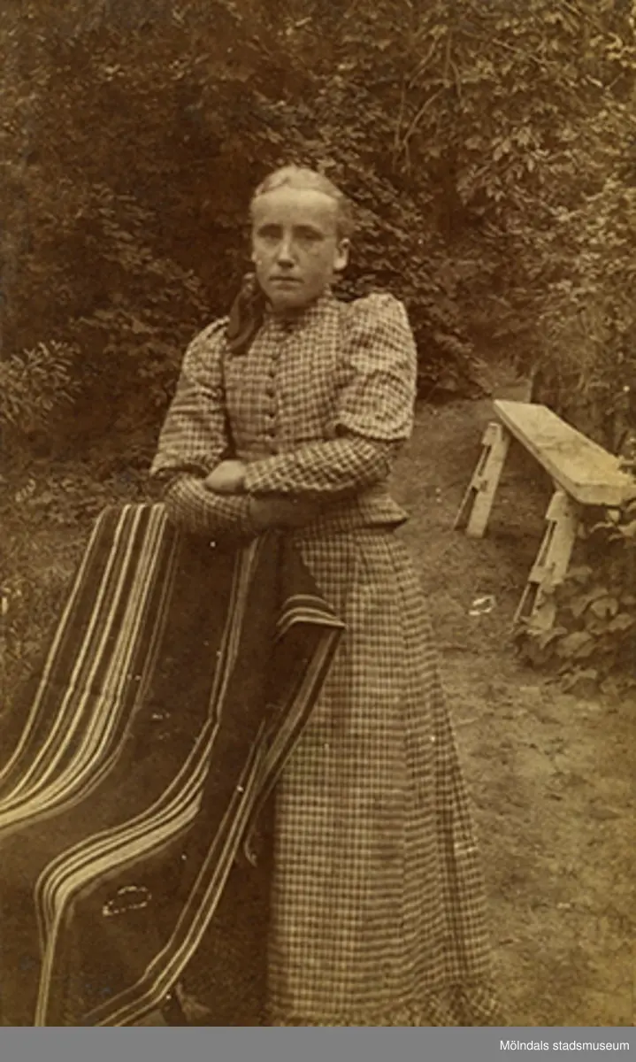 Helfigursporträtt av en stående kvinna, taget utomhus, cirka 1890.
