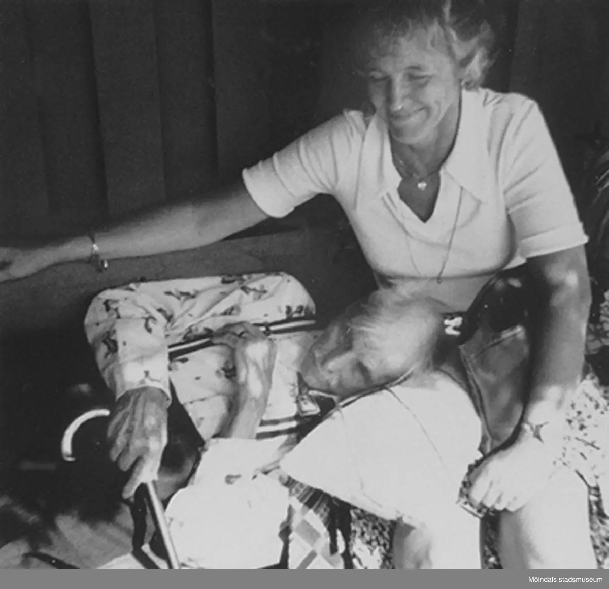 Brogården och Brattåshemmet på utflykt, okänd plats och årtal. Johan Aronsson vilar i knäet på vårdbiträde Gunborg Lans.