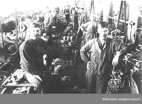Uppställning för fotografen i en metallverkstad i början av 1900-talet. Okänd ort.