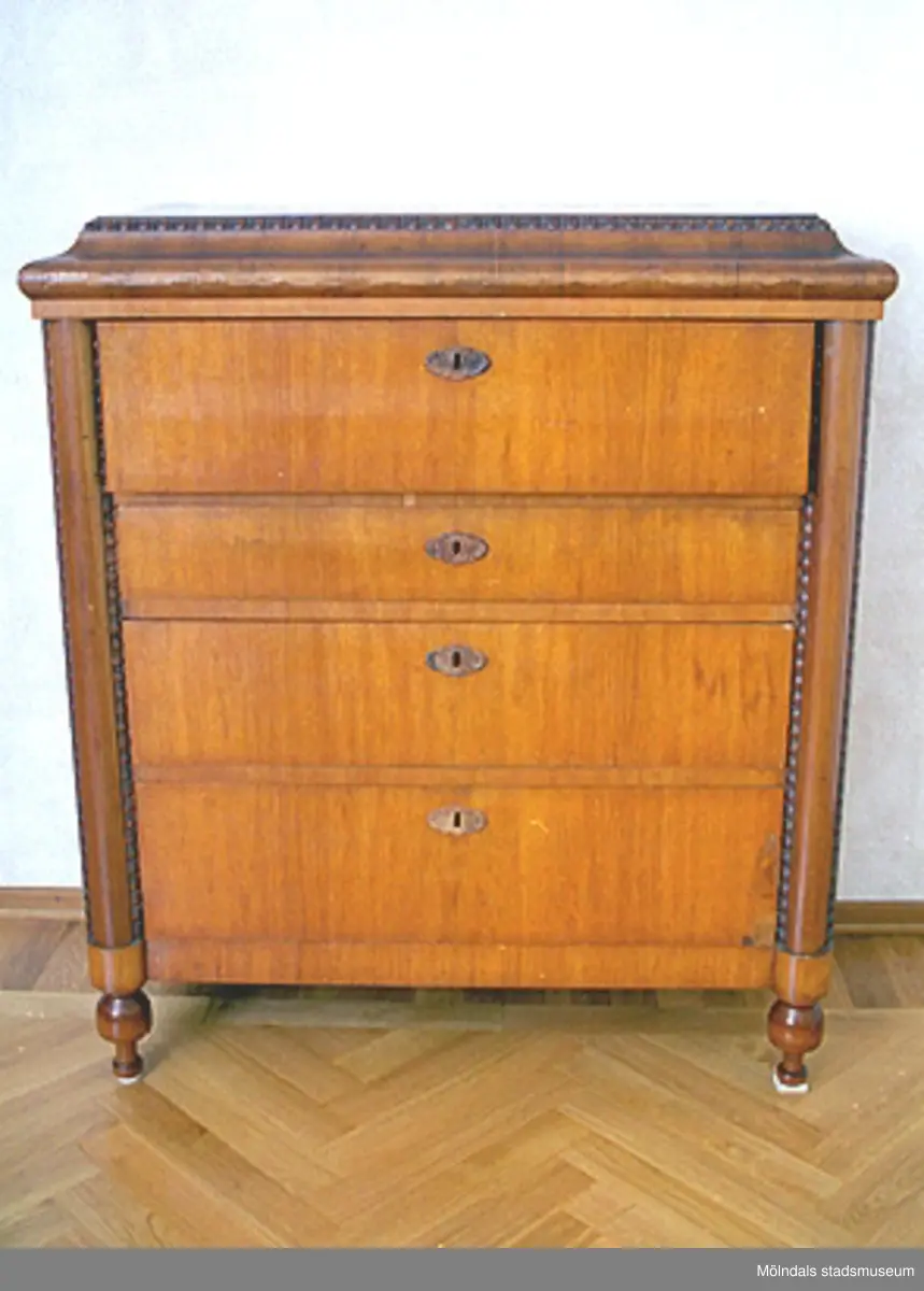 Klaffbyrå, kallades dambyrå i Lindome, fanerad i björk. Tillverkad på Salves gård som brudgåva till ägarens mormor Clara Hasselberg.