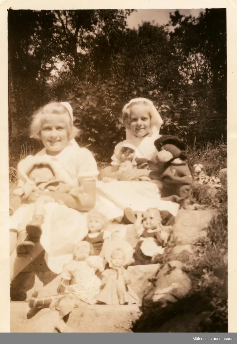 Berit Gustafsson och Annemarie Berndtsson sitter i trappan med alla deras dockor och nallen "Jack" i trappan utanför ett av husen i "Stusshålan", Kryssgatan i Mölndal.