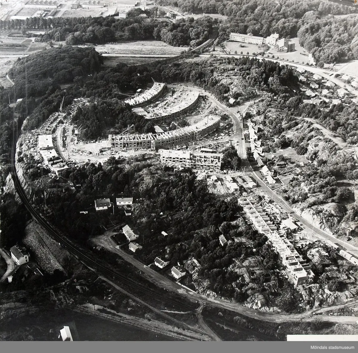 Bostadsbebyggelse under uppförande på Enerbacken i Mölndal. Flygfoto 1963.