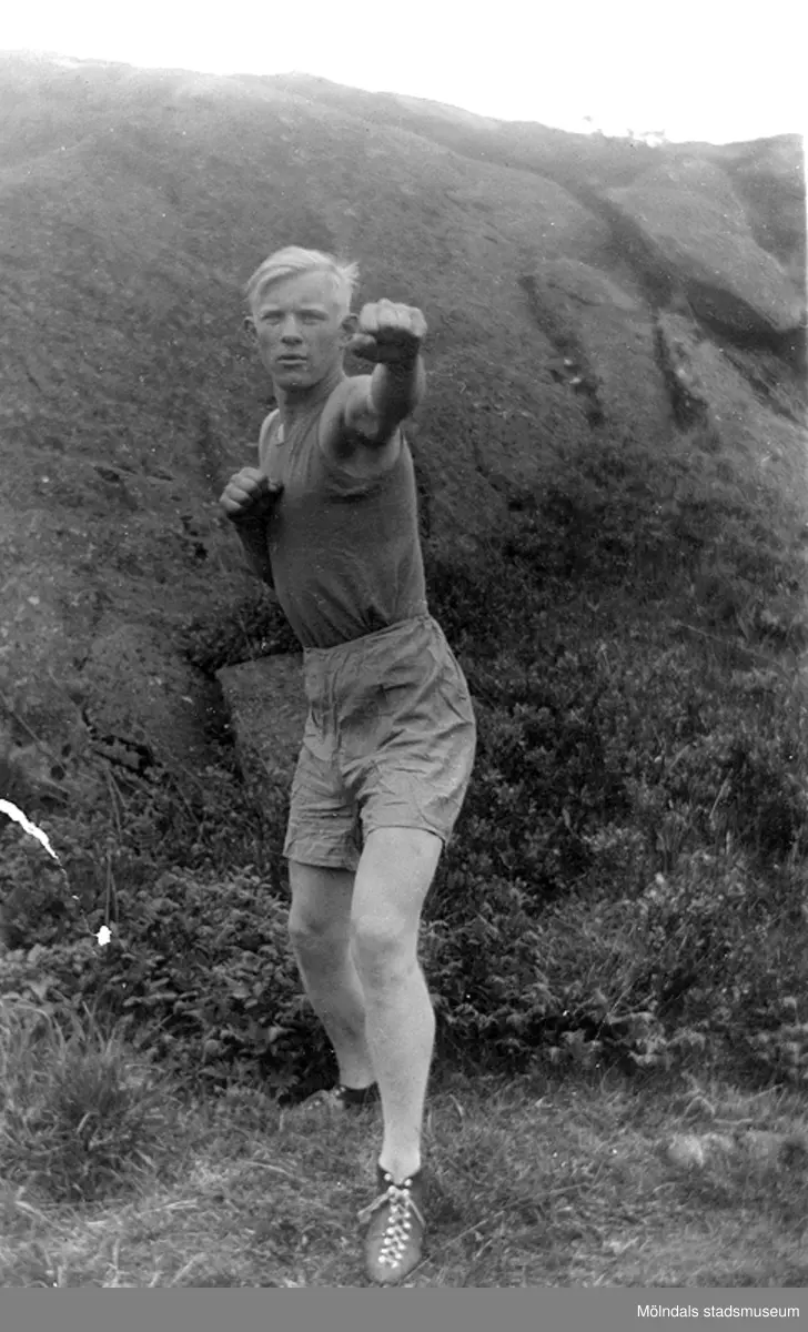 Tungviktsboxare Henry Nicklasson, bosatt i Mölndal, i boxarpose. HN var skandinavisk tungviktsmästare, tillhörde Mölndals Boxningsklubb, och senare Redbergslids.