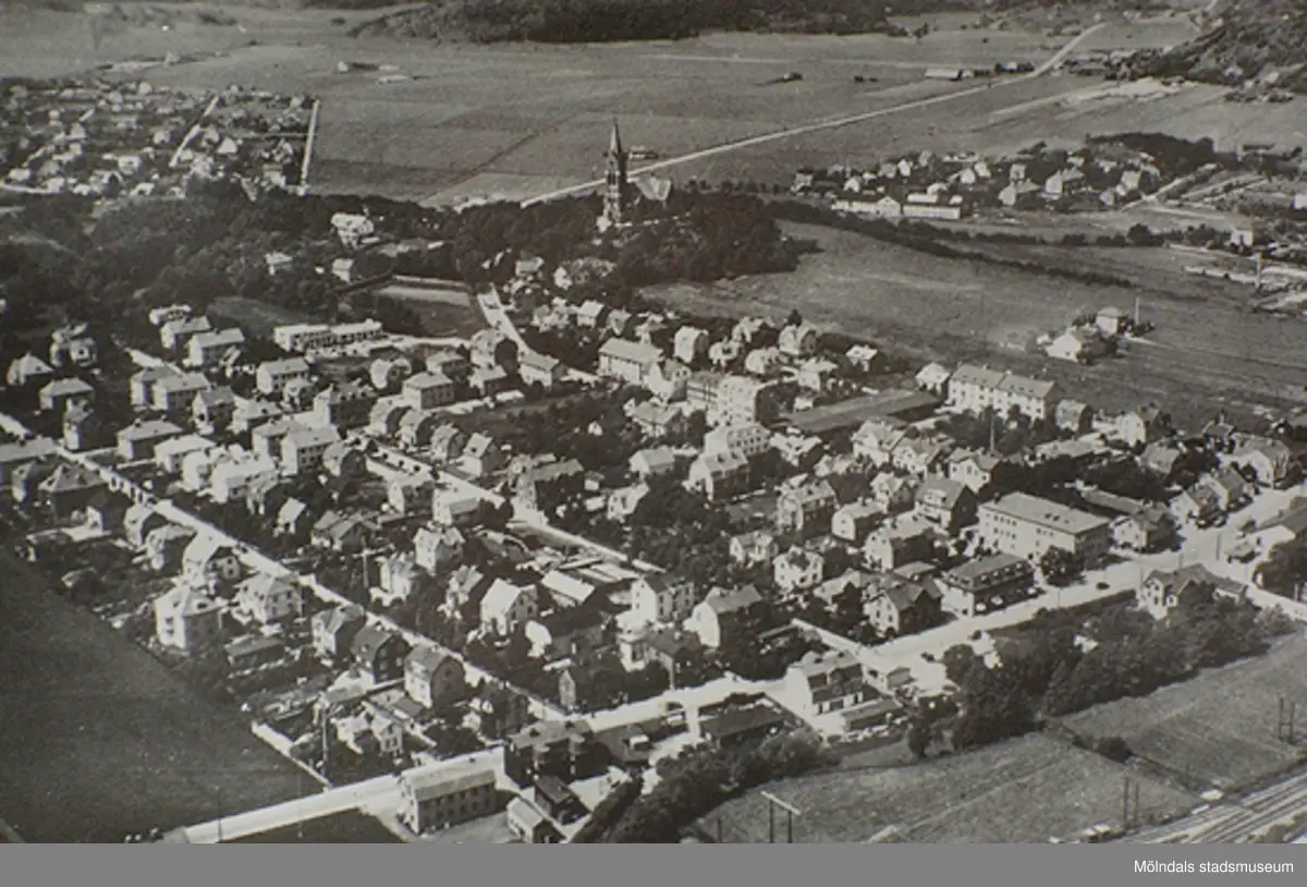 Flygfoto över Broslätt och Mölndalsbro från sydost. Man ser Kungsbackavägen, Göteborgsvägen, Barnhemsgatan, Broslättsgatan, Lillgatan, Frölundagatan och Bergmansgatan.