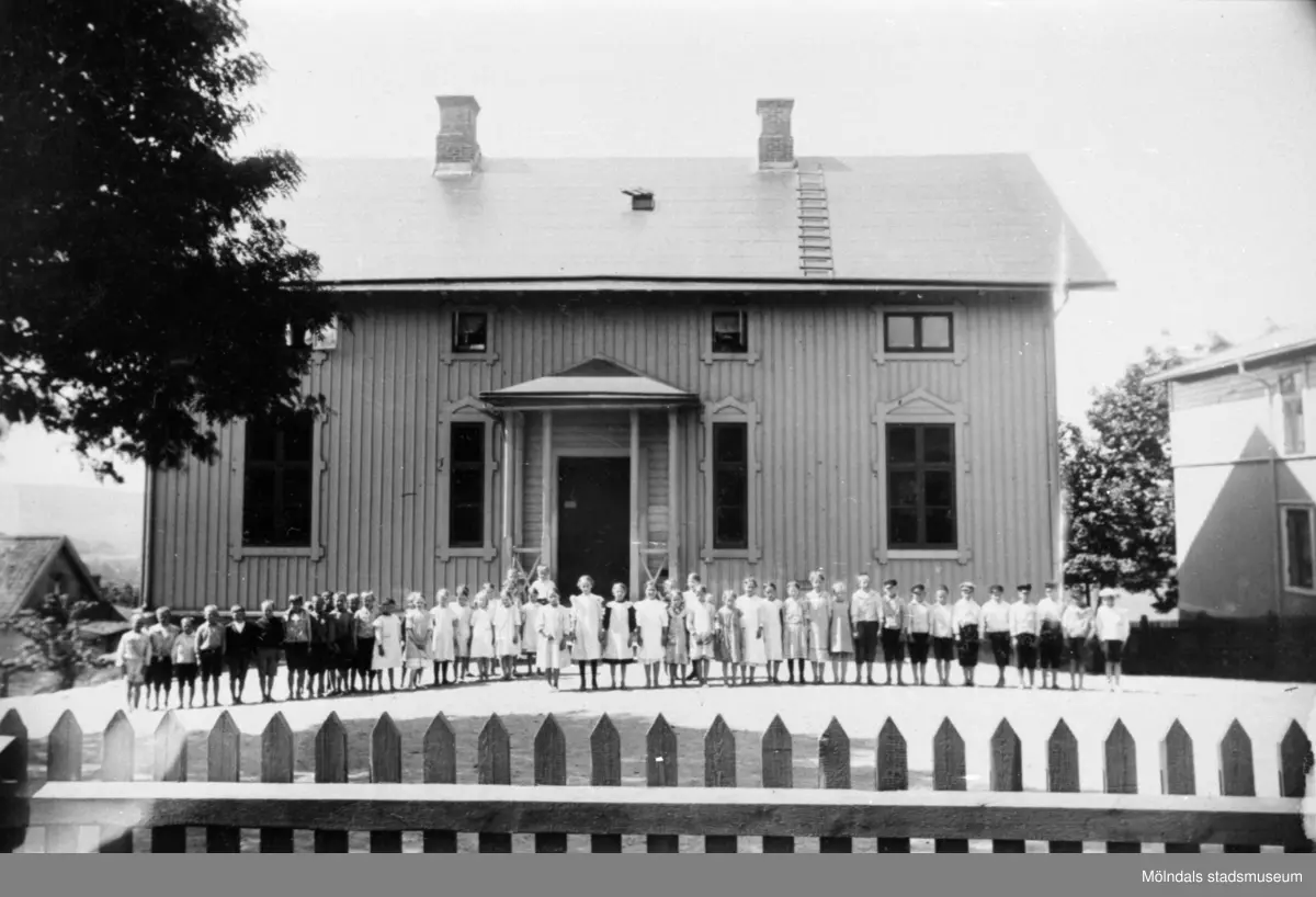 Ormås småskola. Skolbarn framför skolbyggnaden på skolgården.