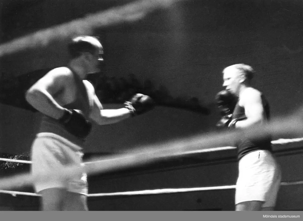 Tungviktsmästare Henry Nicklasson, bosatt i Mölndal, i boxningsmatch mot okänd motståndare. HN tillhörde Mölndals Boxningsklubb, och senare Redbergslids.