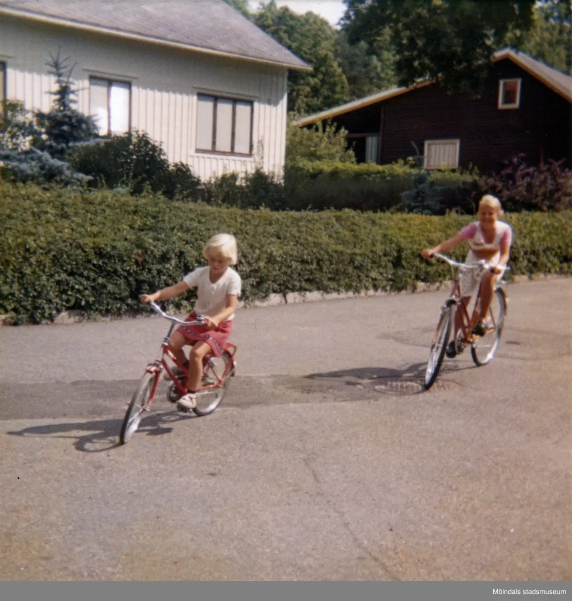 Systrarna Christine och Ingela cyklar på vändplanen i "Stusshålan" på Kryssgatan i Mölndal. På den här gatan lärde sig Christine att cykla. Ca 1976.