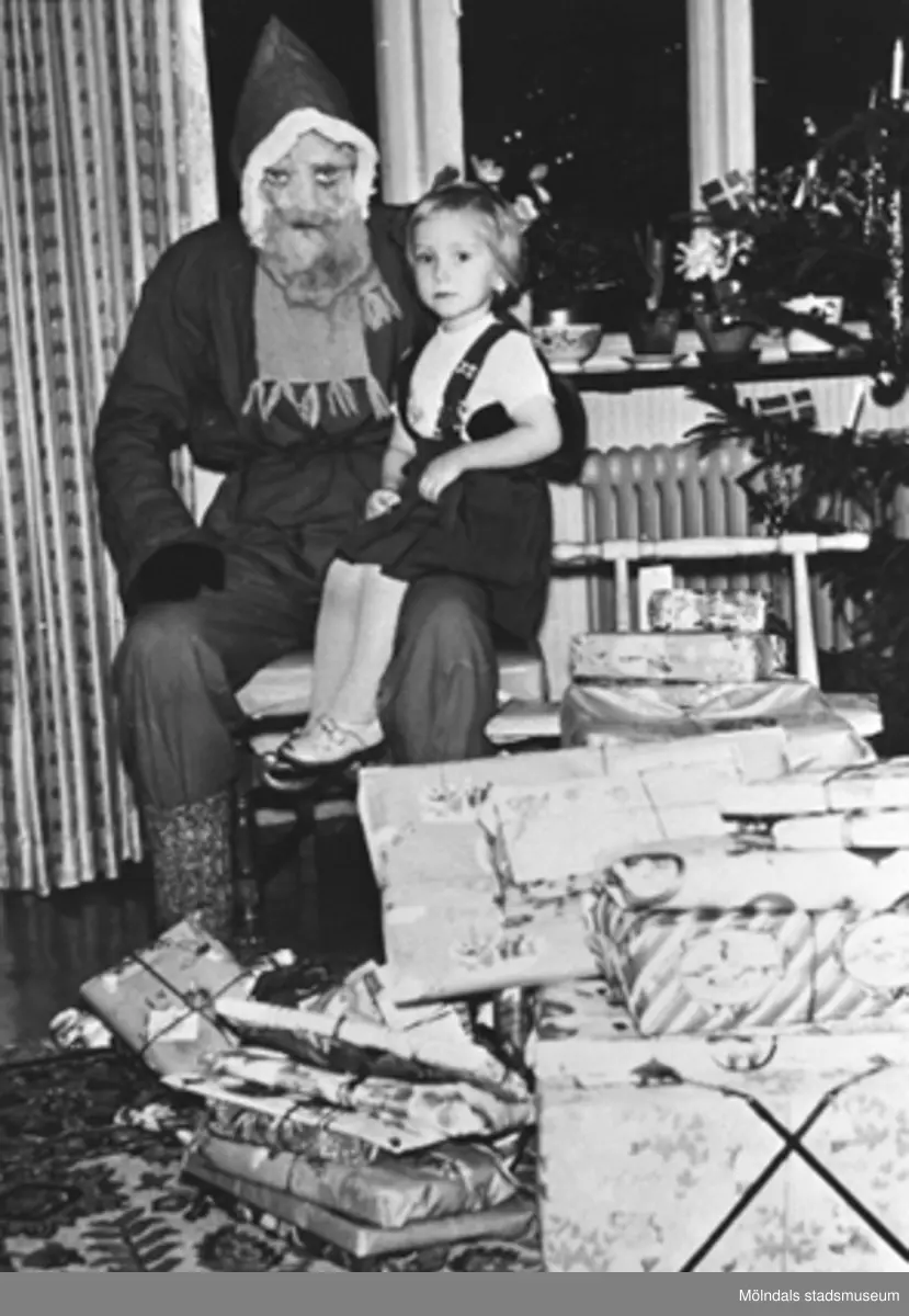 Jultomte med en flicka i knät och julklappar omkring sig. Okända personer, plats och årtal.
