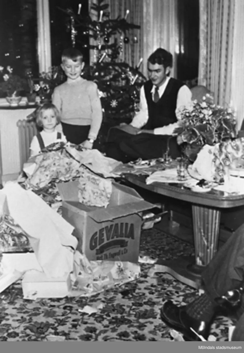 Två barn och en man öppnar sina julklappar vid granen. Okända personer, plats och årtal.