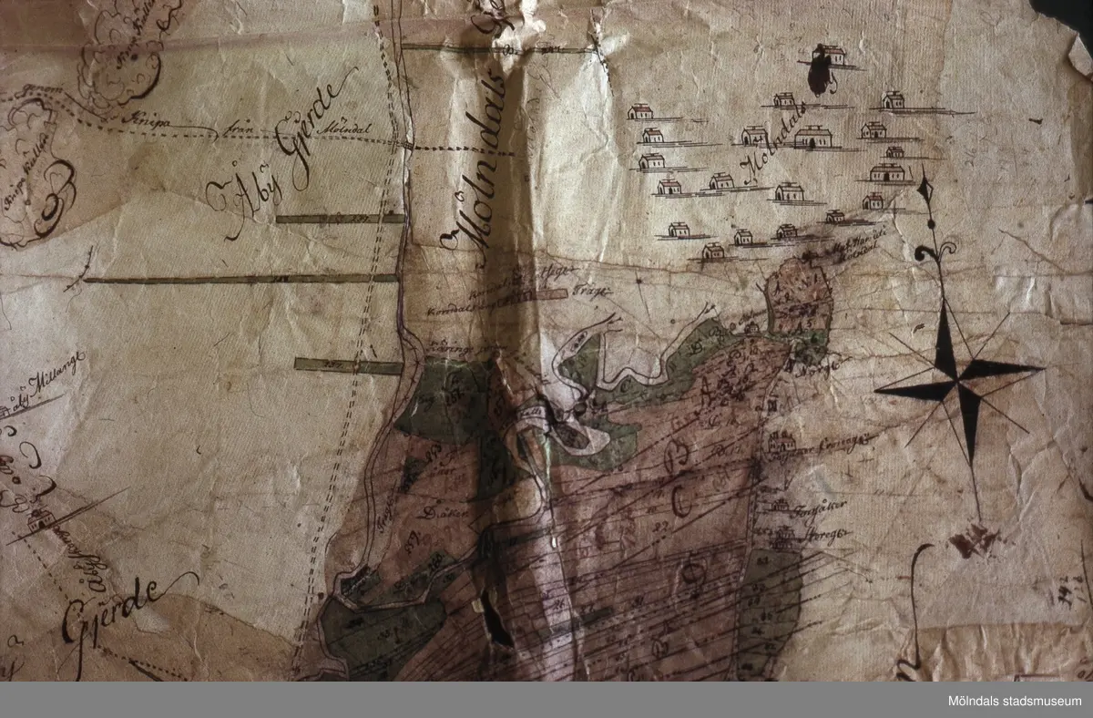 Karta från 1700-talet med fingerad by på platsen för nuvarande Kvarnbyn.