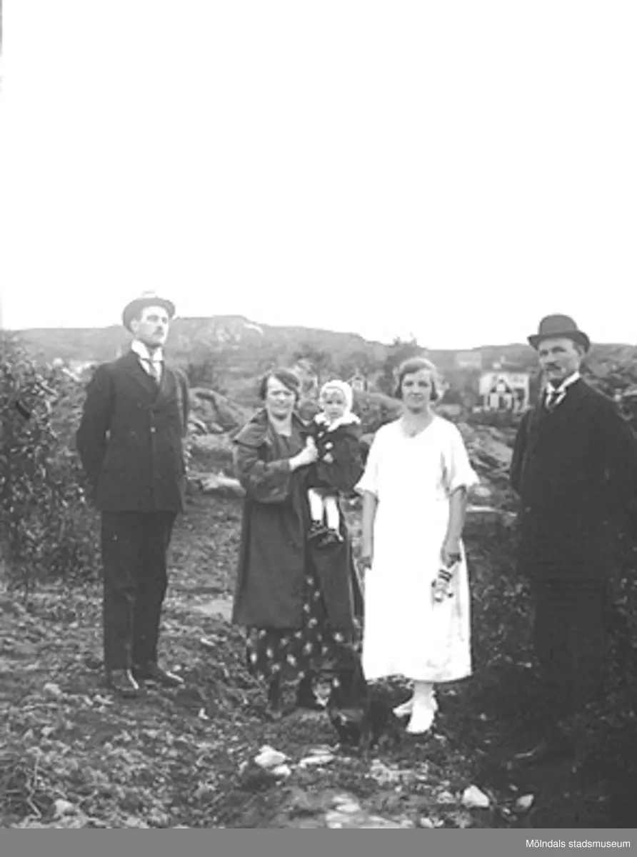 Toltorpsdalen i Mölndal på 1920-talet. Två män, två kvinnor och ett barn stående i ett landskap.
