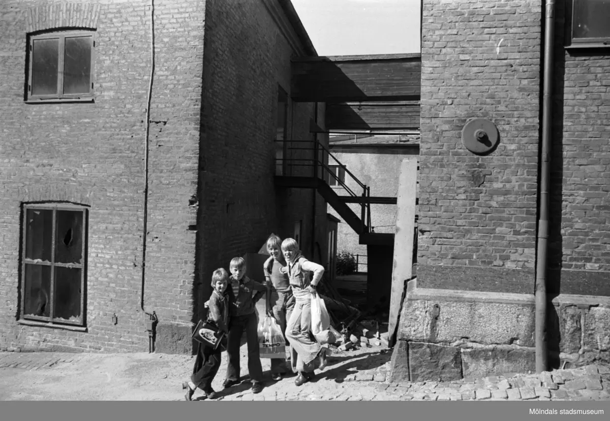 Titel: Kvarnfallet 24 vid Götaforsliden i Mölndals Kvarnby. Kvarnbyggnad. En grupp barn står lutade mot ena väggen.