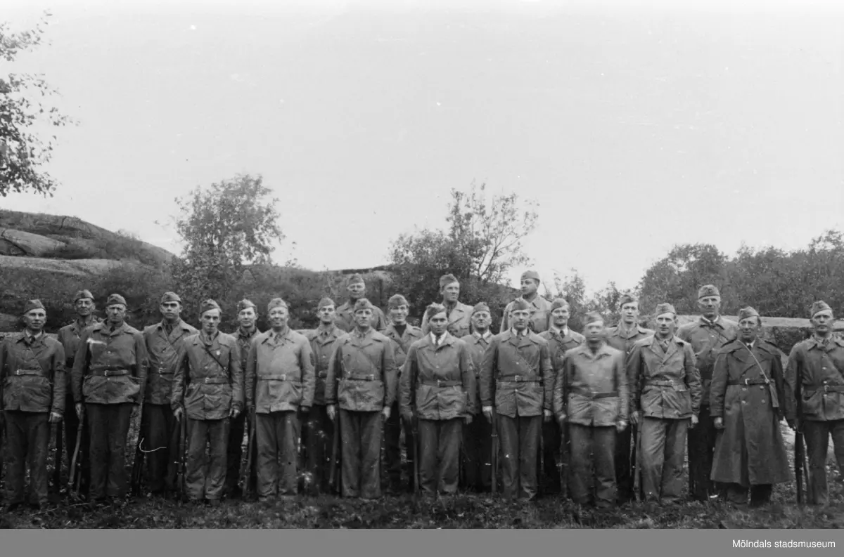 Män, tillhörande hemvärnet i Mölndal, ståendes i Kikås under andra världskriget 1940-45.